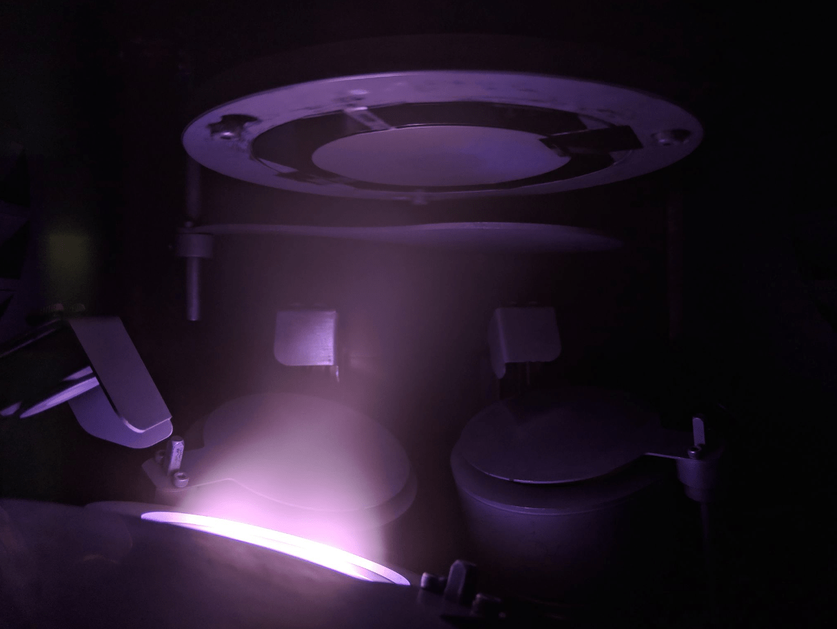 La figura muestra el depósito de aluminio, el color púrpura es el plasma de iones de Argón dentro de la cámara del Magnetron Sputtering en las instalaciones del cuarto limpio de CIDESI Querétaro.
