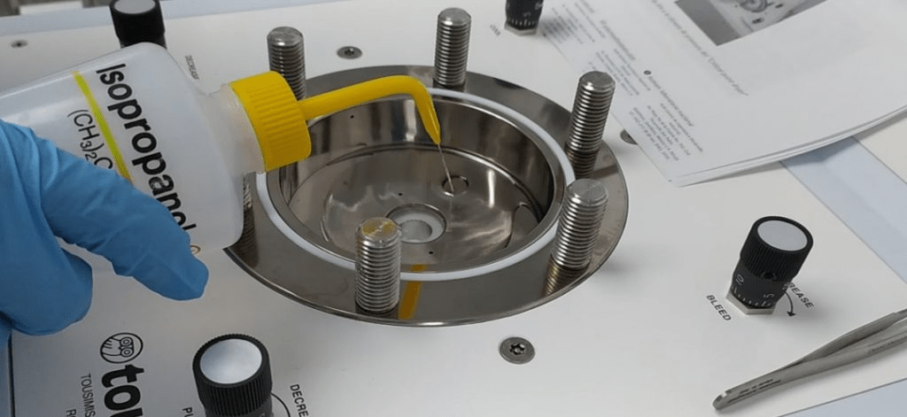 Fig. 3. En la imagen se observa el llenado de la cámara del CPD con Isopropanol. Su función es ser un líquido intermediario o de transferencia, que será posteriormente remplazado por el LCO2. El IPA debe ser de alta pureza con la finalidad de evitar la contaminación de las microestructuras al momento de ser liberadas.